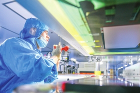 10月9日,永州市道县高新技术产业开发区湖南沃玻科技有限公司,工人在触摸屏玻璃盖板生产流水线上作业。图/视觉中国