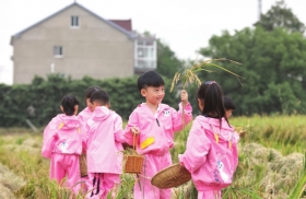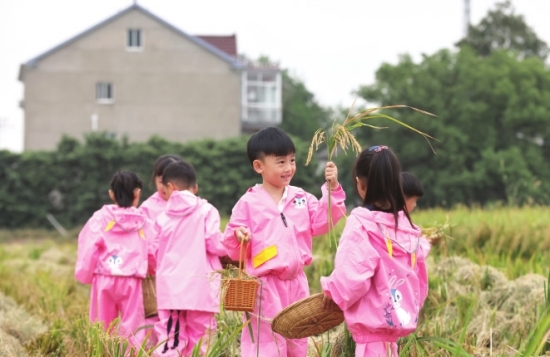 10月14日,浙江省湖州市德清县乾元镇第一幼儿园孩子们在卫星村稻田捡拾稻穗。临近世界粮食日,各地开展世界粮食日主题活动。图/新华社