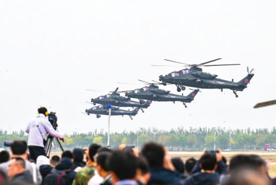 10月16日,在第七届中国天津国际直升机博览会开幕式上,陆军“风雷”飞行表演队进行飞行表演。图/新华社