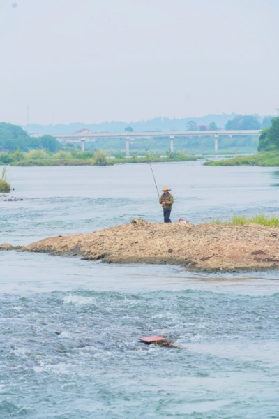 “坐观垂钓者,徒有羡鱼情。”一般人都会选择开阔、障碍物少的地方抛线甩竿,怡然自得。也有人站在大桥上凭栏而钓,躲在桥洞里钓,晚上夜钓,在自己岸边搭建的“钓鱼台”上钓,大有“一曲高歌一樽酒,一人独钓一江秋”之架势。更有“真的猛士”趁河中“放水”的时机,穿上雨裤,跳到河里,于湍急水流中挥竿自如,淡定自若,远远望去,就像一尊“河神”矗立在水中央。也有好心过路人瞧见,忍不住朝他大喊:“老稳点啊,莫绊河里喂鱼去哒!”