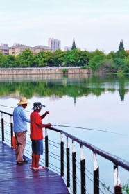 每天晨跑,我都可以看见一对老年夫妇在天马大桥下一起垂钓,一人一竿,各自打饵、甩竿,动作娴熟,渔获颇丰。有时老伴扯了一条鱼儿上岸了,另一位马上过来帮忙取钩,人生风雨,这才是真正的“夫唱妇随”啊。我还发现一位老头,八点钟左右老伴保准提着一个保温桶“送早饭来了”,风雨无阻,相伴相依,实乃人间温情。