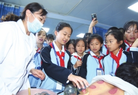 10月21日,郴州市嘉禾县人民医院,医护人员给学生讲解针灸拔火罐中医诊疗。当日,该院与驻地学校开展“中医药文化进校园”主题活动,学生通过学习中医药知识,了解针灸、拔火罐等传统中医诊疗,感受中医药文化魅力,迎接10月22日“世界传统医药日”的到来。 图/通讯员黄春涛