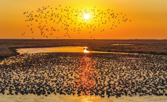 10月22日,在黑龙江挠力河国家级自然保护区,候鸟在晨光中翔集。时下正值黑龙江省候鸟迁徙高峰期,全省各个候鸟栖息地的候鸟大量聚集南迁,铺展出万鸟翔集的生态画卷。图/新华社