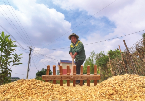 10月23日,农民在衡阳市衡东县霞流镇晾晒稻谷(无人机照片)。10月23日是霜降节气,各地农民在田间地头忙于管护、收获等工作,随处可见他们忙碌的身影。图/新华社